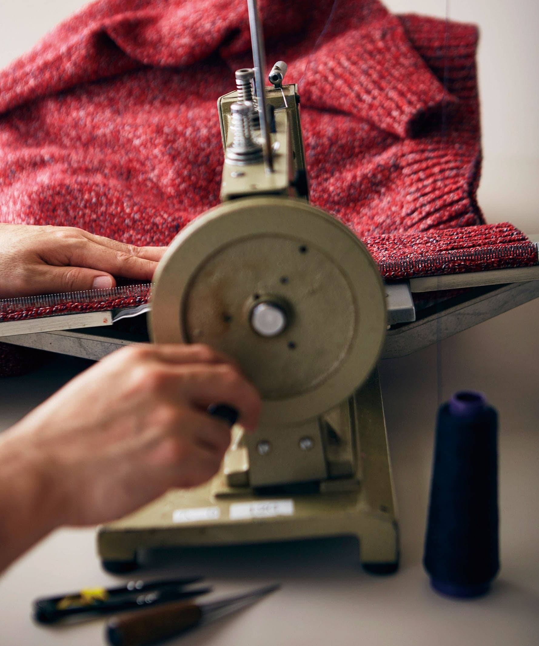 業界でいち早く欧州を視察した際、各地でニット製品の手触りや着心地をたしかめた創業者の大江良一は「見えないところにまで誠意がこもり手抜きがない、感嘆するしかない」と述懐している。そして、ニットの弛みと伸縮性を考慮したパターンメイキングと、新たに取り組む裁断と縫製。裏側まで丁寧に。心血を注ぎ完成度を高める。